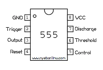 IC timer 555 merupakan IC atau sirkuit terpadu (chip) yang digunakan dalam berbagai aplikasi pewaktuan, sumber pulsa gelombang, serta aplikasi osilator. Secara fisik IC 555 berbentuk DIP atau Dual inline Package dengan package 8 pin. Berikut ialah susunan dan konfigurasi kaki IC 555 yang berbentuk DIP 8 kaki.